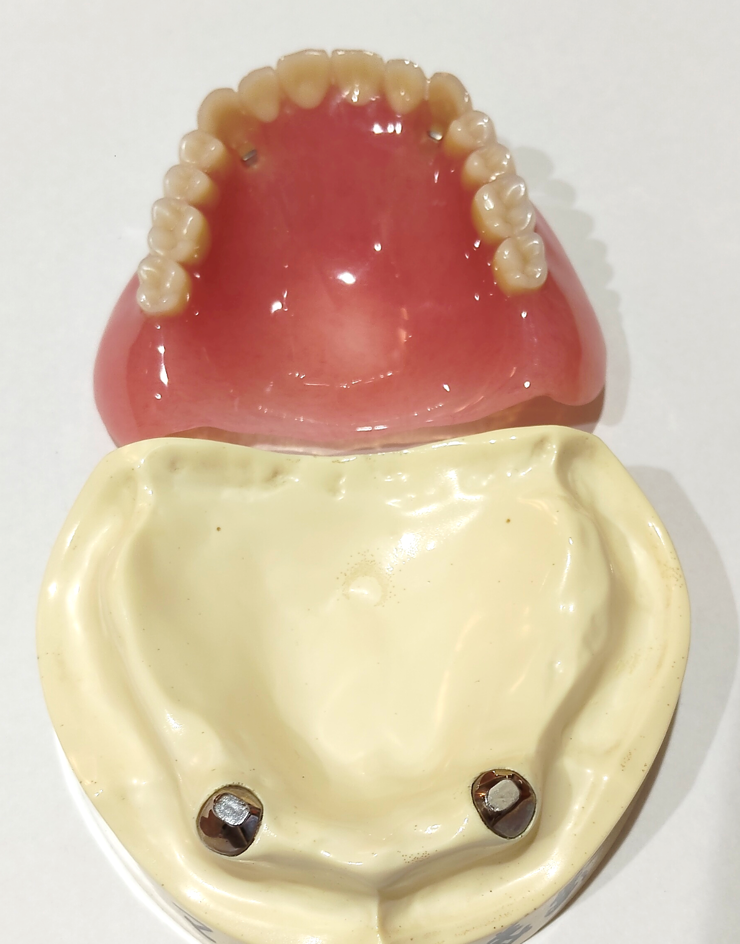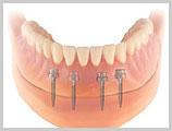 ミニインプラント義歯とは、顎の骨に埋め込んだ小型のインプラント(人工歯根)に入れ歯を固定する治療法です。